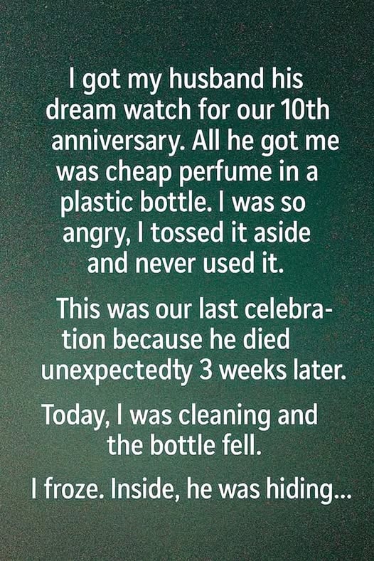 I had pictured our tenth anniversary as a carefully choreographed moment—soft light, shared laughter, and gifts that reflected the life we’d built together. I planned for months, saving enough to surprise my husband with the watch he’d admired for years. When it was my turn to open his gift, I found a small plastic bottle of perfume. It looked ordinary, even rushed. I smiled and thanked him, but inside, disappointment settled quietly. I told myself it wasn’t about money—it felt like a lack of thought, and that assumption followed me into the night.What I didn’t know then was how quickly perspective can change. Just weeks later, my world stopped without warning. A single phone call rewrote everything, leaving me to move through familiar rooms that suddenly felt hollow. His belongings remained exactly where he’d left them, each one carrying weight. Tucked away in a drawer was the perfume, untouched. Every time I noticed it, regret surfaced. I had judged a gift without understanding the care behind it, and now there was no chance to revisit that moment.