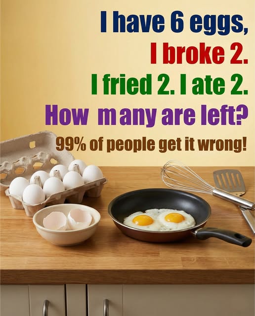 The riddle is usually presented in a simple, direct form: “I have six eggs. I broke two, fried two, and ate two. How many eggs are left?” At first glance, the wording sounds like three separate actions involving three different sets of eggs. Because of that, many people instinctively add the numbers together and conclude that all six eggs must be gone. It feels like a neat, logical answer, which is why so many stop there. The trick works because we often skim sentences, assume missing details, and let our brains “auto-fill” the meaning without carefully checking what was actually said.