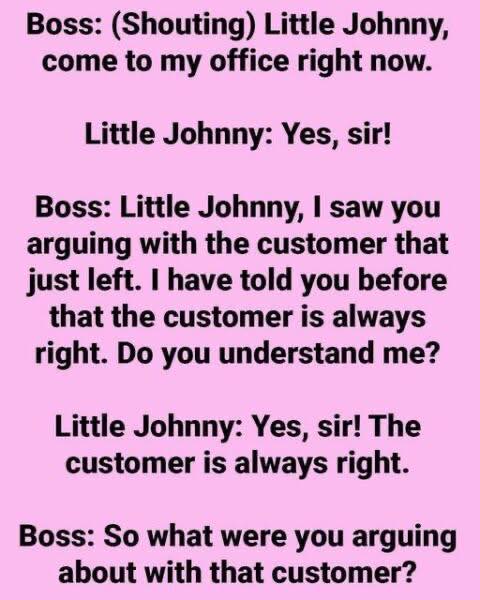 Boss: (Shouting) Little Johnny, come to my office immediately.Little Johnny: Yes, sir! Boss: Little Johnny, I noticed you arguing with the customer who just left. I’ve told you before that the customer is always right.Do you understand? Little Johnny: Yes, sir! The customer is always right. Boss: So, what were you arguing about with that customer? Little Johnny: He said my boss is stupid and an idiot, sir! Boss: That foolish man. What did you say to him? Little Johnny: I told him he’s right.